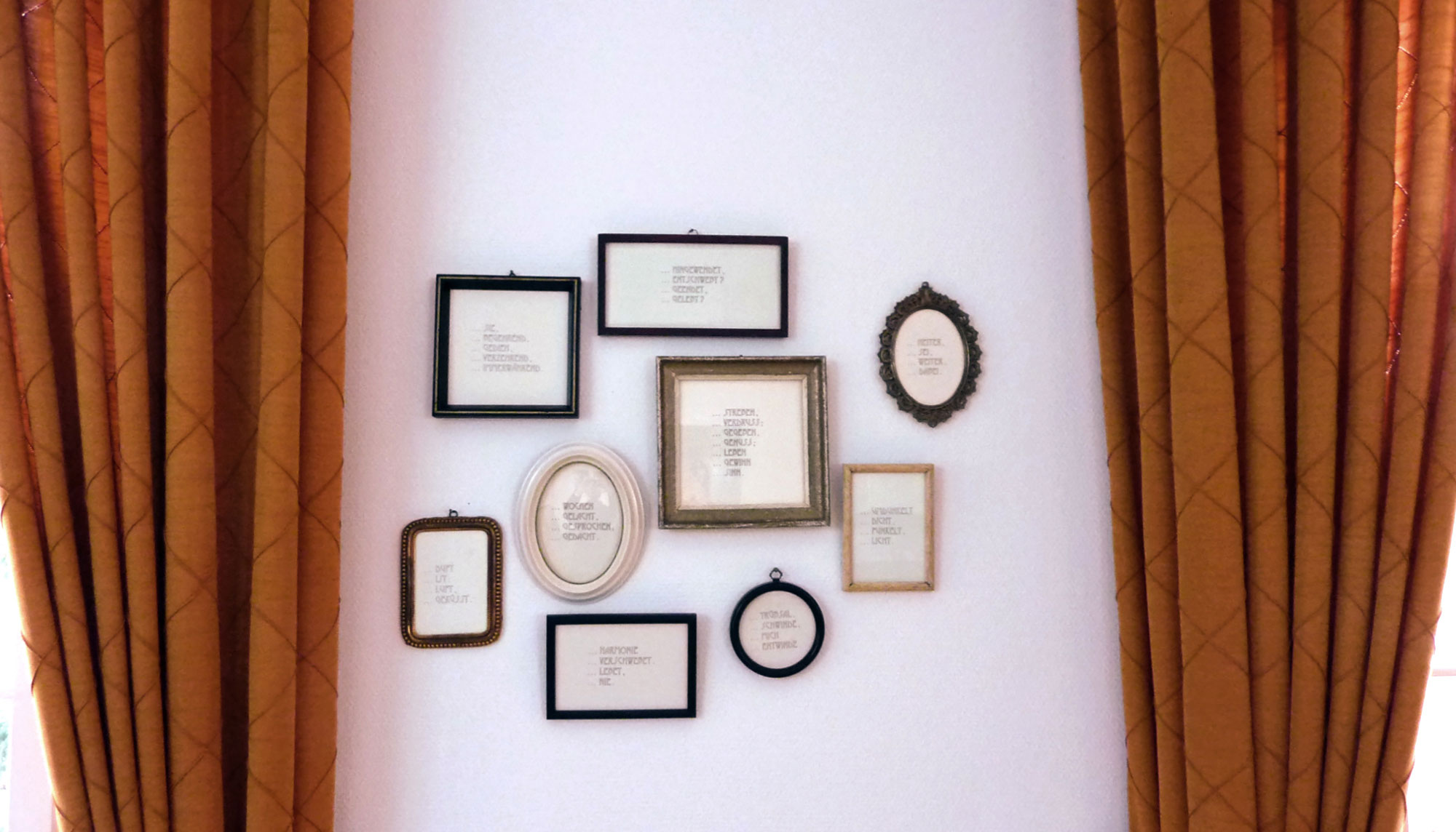 „Letzte Worte“ wird in schöner semantischer Umlenkung eine umfangreiche Text-Bild-Serie genannt. Die Schlusswörter aus Gedichtzeilen werden isoliert und in eine eher kryptisch konkrete Poesie-Anordnung gebracht und in historisch anmutenden Zierrahmen gesetzt. Die losen Bedeutungsfäden und neuen Wortfolgen zusammen mit den offenkundigen Leerstellen eröffnen Raum für unsere Projektionen: Handeln, Vergessen, Nacht, gesagt – emotional und atmosphärisch hoch aufgeladene Reizwörter, an denen sich reiche Assoziationen entzünden können.